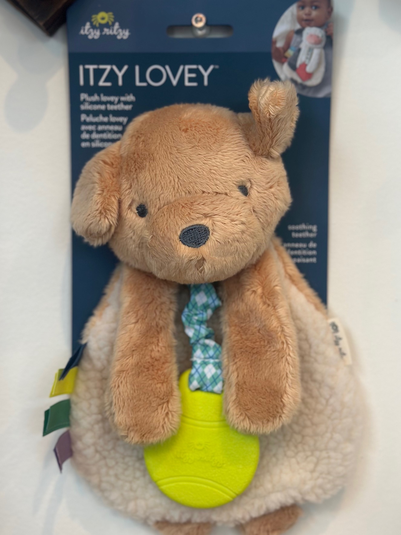 Plush lovey with silicone teether. Natural cotton fabric